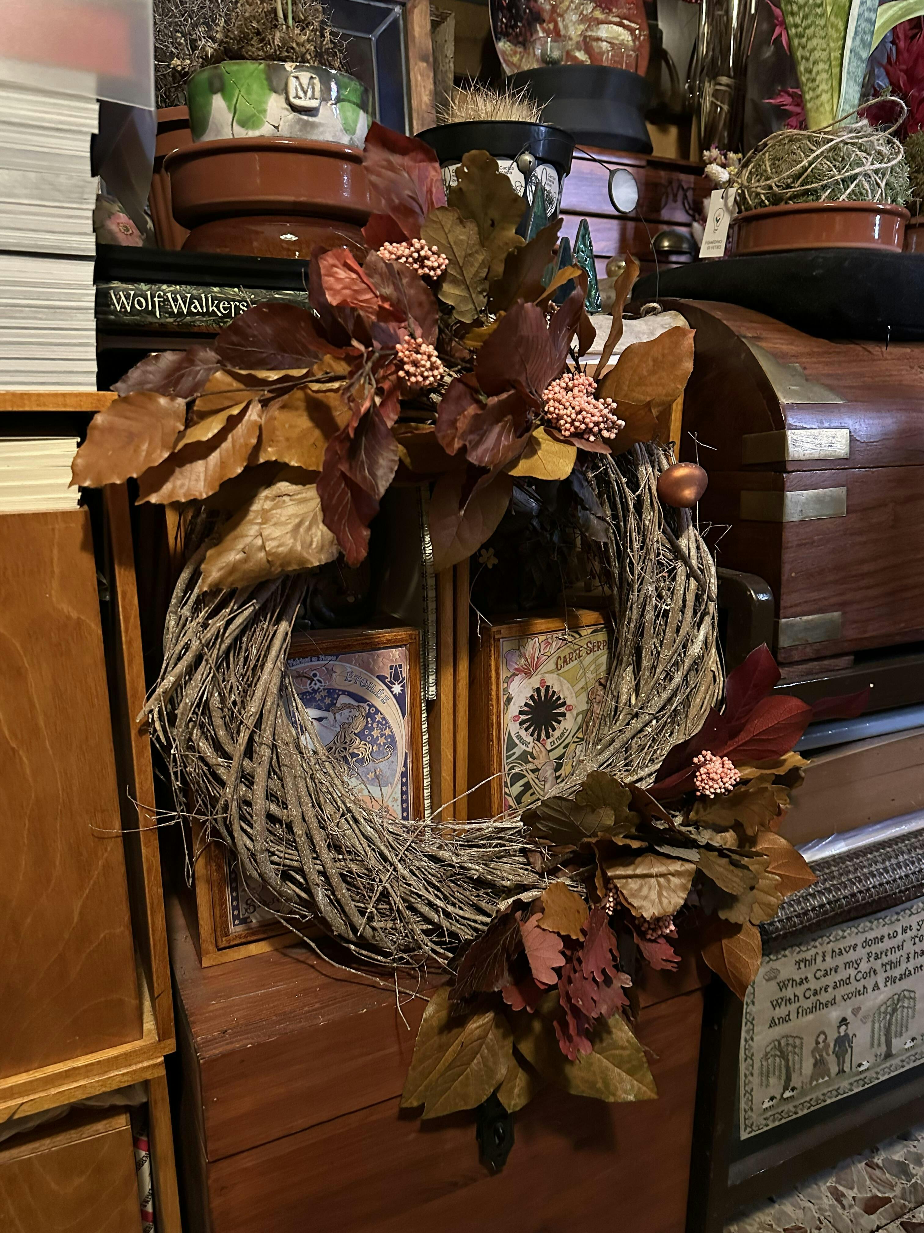 Composizione autunnale realizzata con salal, faggio, castagno, quercia e fiore del riso, tutti stabilizzati. La ghirlanda è impreziosita da una piccola pallina in vetro effetto vintage che dona un tocco raffinato e decorativo.